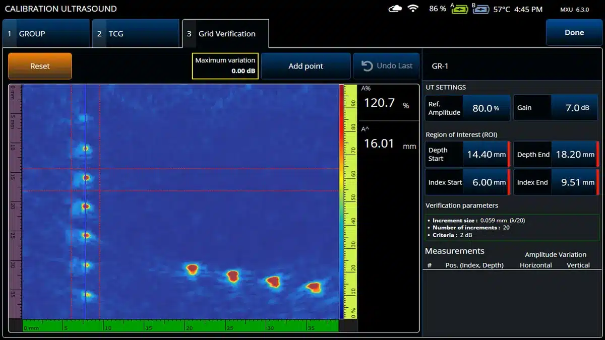 Công cụ xác minh lưới TFM tuân theo các quy trình được khuyến nghị được nêu trong các quy chuẩn ISO và ASME và xây dựng trên các công cụ hiệu chuẩn hiện có như Hiệu chuẩn TCG cho TFM và Hiệu chuẩn vận tốc cho PA. Nó xác minh lưới TFM cho từng bộ phản xạ riêng lẻ bằng cách cho phép người dùng chọn một vùng quan tâm (ROI) và tự động dịch chuyển lưới tái tạo theo các bước tăng nhỏ theo chiều ngang và chiều dọc.